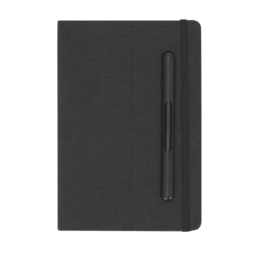 Bloc de notas soporte con tapas rígidas fabricado en RPET 600D. Versátil soporte integrado en la portada. Incluye bolígrafo lápiz eterno. Contiene 96 hojas interiores a disposición de una raya.  Cuenta con elástico de cierre. Con logotipo RPET.