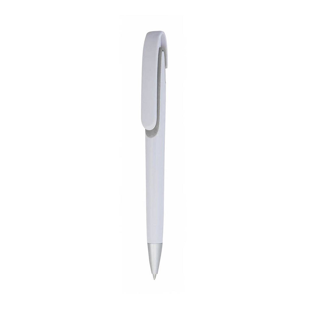 Bolígrafo de mecanismo pulsador de atrevido diseño tricolor con accesorios en vivos colores y cuerpo de suave acabado en color blanco sólido. Con original clip curvado a juego y cómoda empuñadura. Tinta azul.