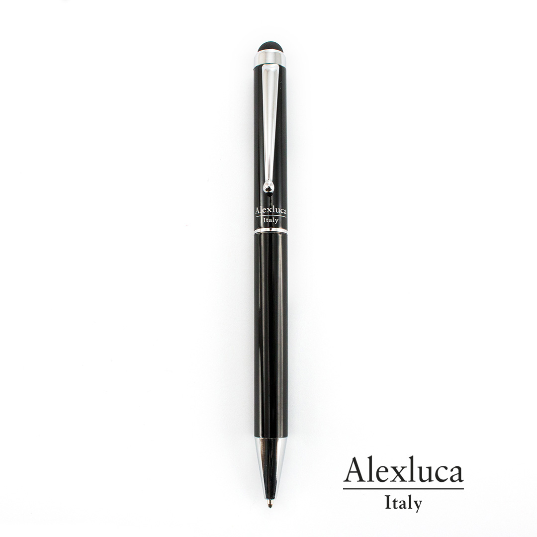 Bolígrafo puntero de Alexluca de mecanismo giratorio con suave cuerpo metálico de elegante color negro. Clip y punta de diseño a juego. Presentado en estuche individual negro con logotipo de la marca. Tinta azul.