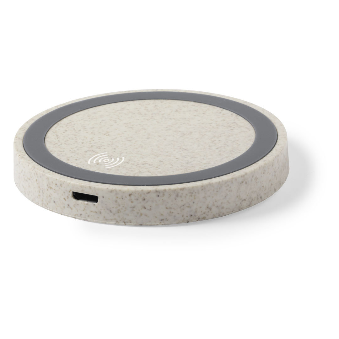 Cargador inalámbrico circular de línea nature. Carcasa en caña de trigo, para así fomentar la utilización de materias primas naturales y reducir las emisiones contaminantes. Con base antideslizante e indicador LED de estado de carga. Compatible con smartphones con tecnología de carga inalámbrica y presentado en atractiva caja de diseño eco.