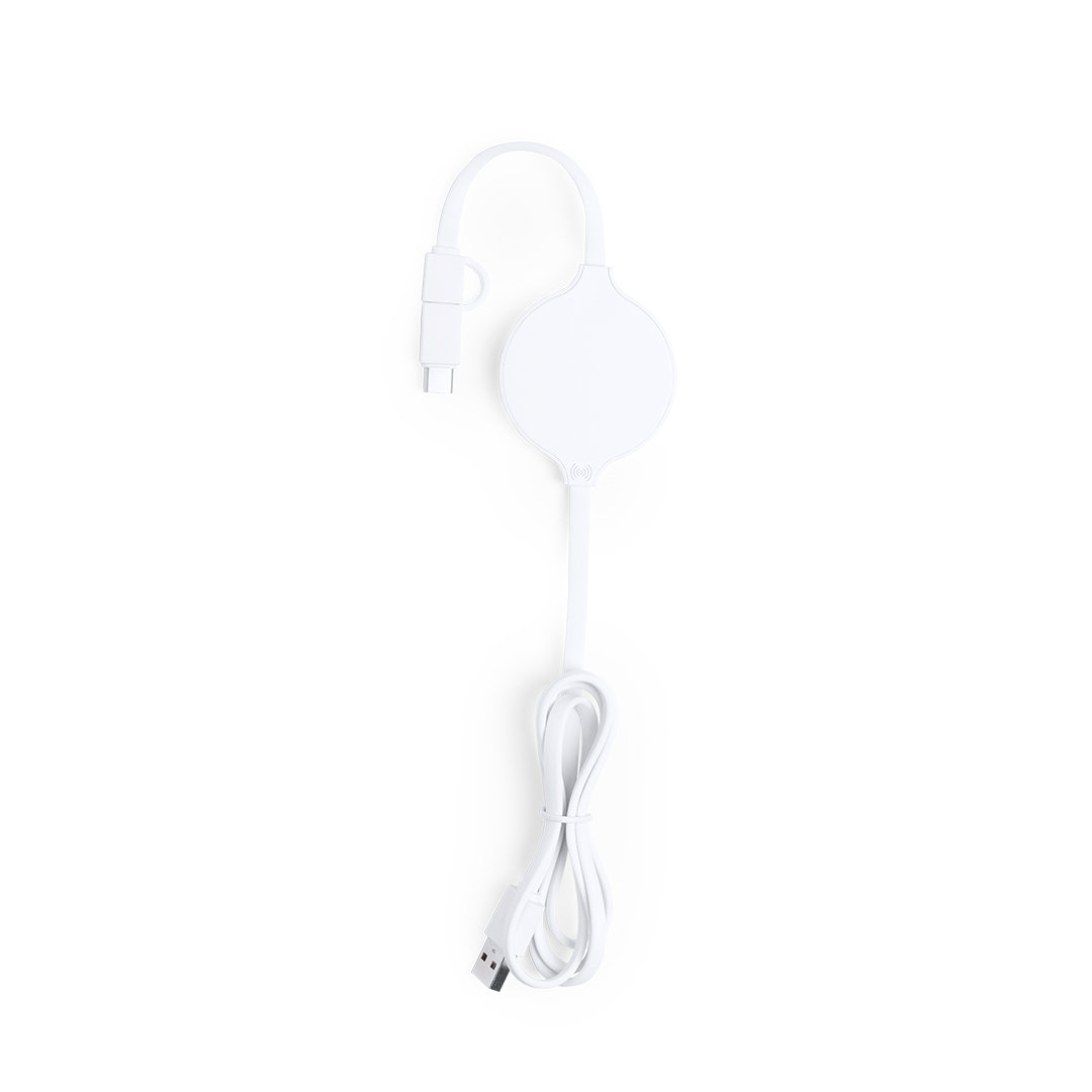 Cargador inalámbrico de diseño ultra compacto en diseño monocolor blanco. Conexión dual micro USB y Lightning, con adaptador Tipo C y luz indicadora de carga. Compatible con dispositivos equipados con tecnología de carga inalámbrica.