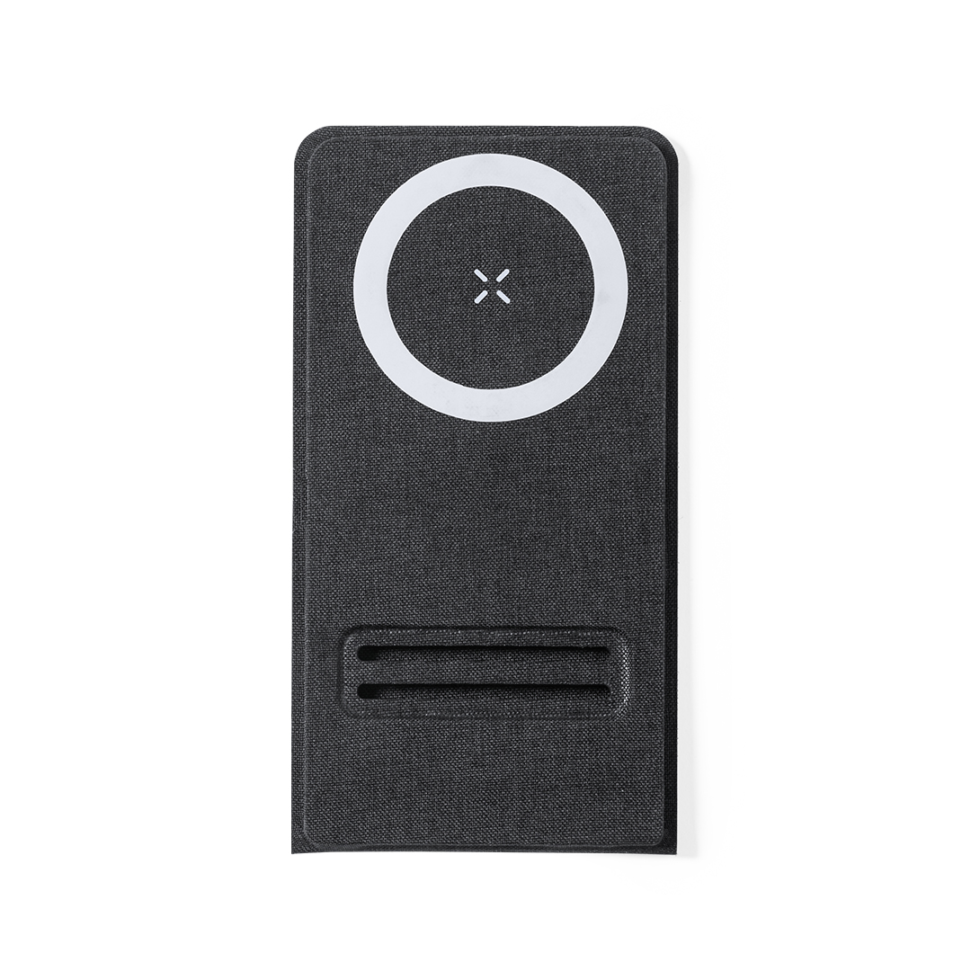 Cargador inalámbrico 15W. Fabricado en resistente poliéster 300D y con fijación magnética para poder usar el dispositivo mientras se produce la carga del mismo e incluyendo anillo adhesivo. Válido para todos los dispositivos con tecnología Magsafe y Qi. Plegado de pequeño tamaño para fácil transporte y presentado en atractiva caja individual de diseño.