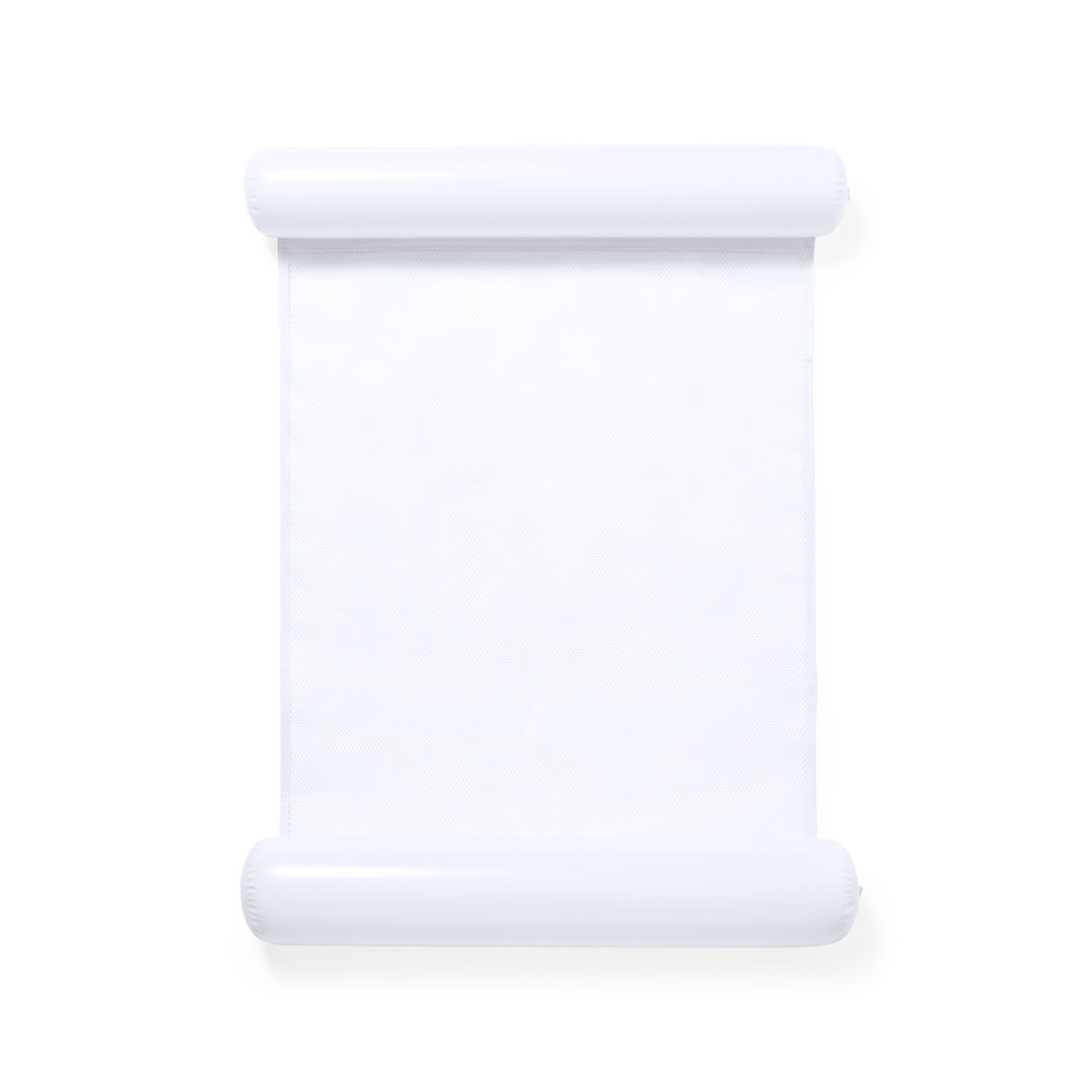 Original colchoneta con extremos hinchables en resistente PVC. Enrollable y con resistente redecilla central de 80x70 cm en poliéster de color blanco. Con plegado especial para fácil impresión y disponible en variada gama de colores.