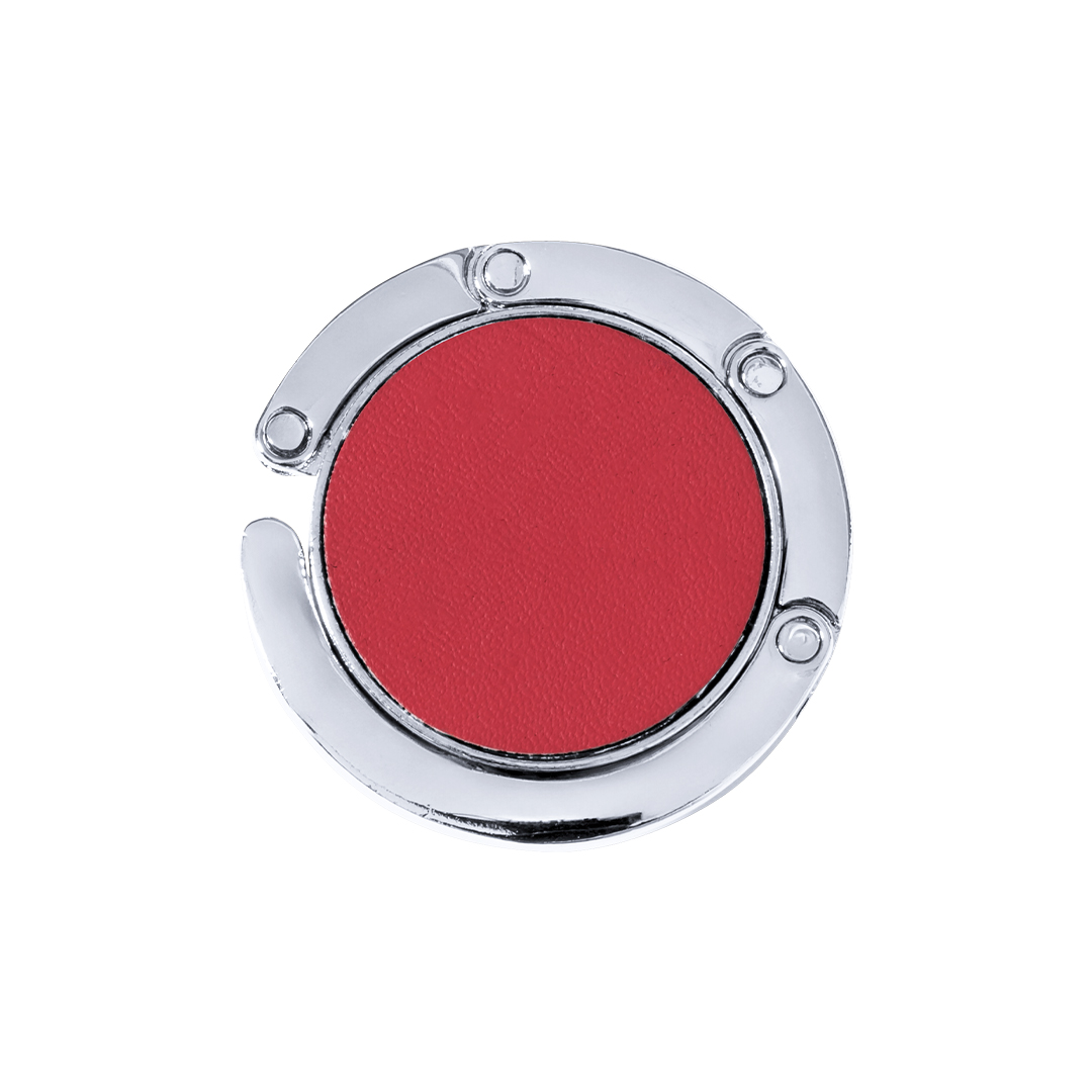 Cuelgabolsos metálico plegable con corona en polipiel de vivos colores. Presentado en estuche individual con interior troquelado.