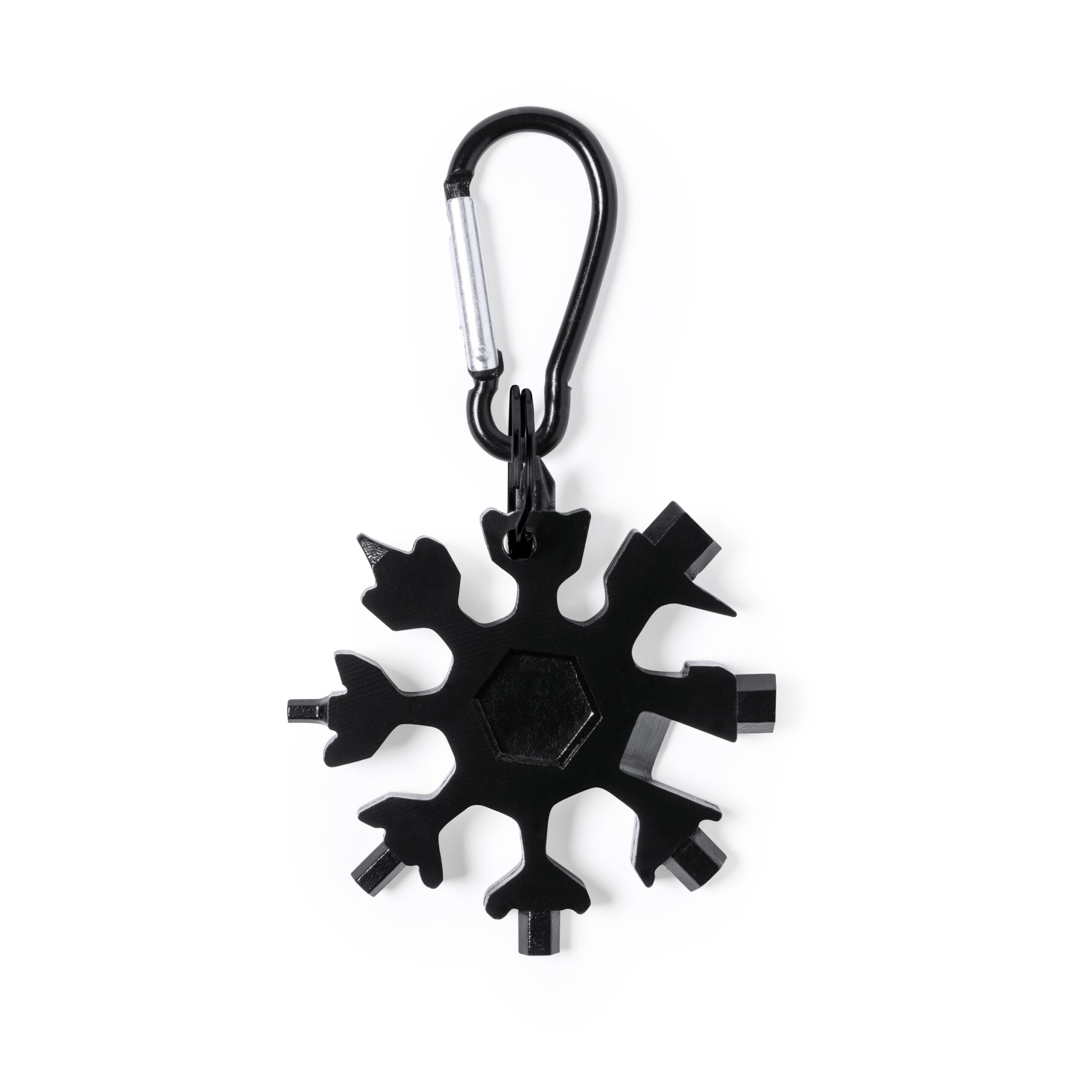Original y práctica multiherramienta fabricada en resistente acero inox de acabado negro, con anilla y mosquetón de transporte a juego. Con 17 funciones, entre otras, destornillador puntas planas y philips; llaves hexagonales tipo allen; cuchillo y abrebotellas. Presentada en caja individual negra.