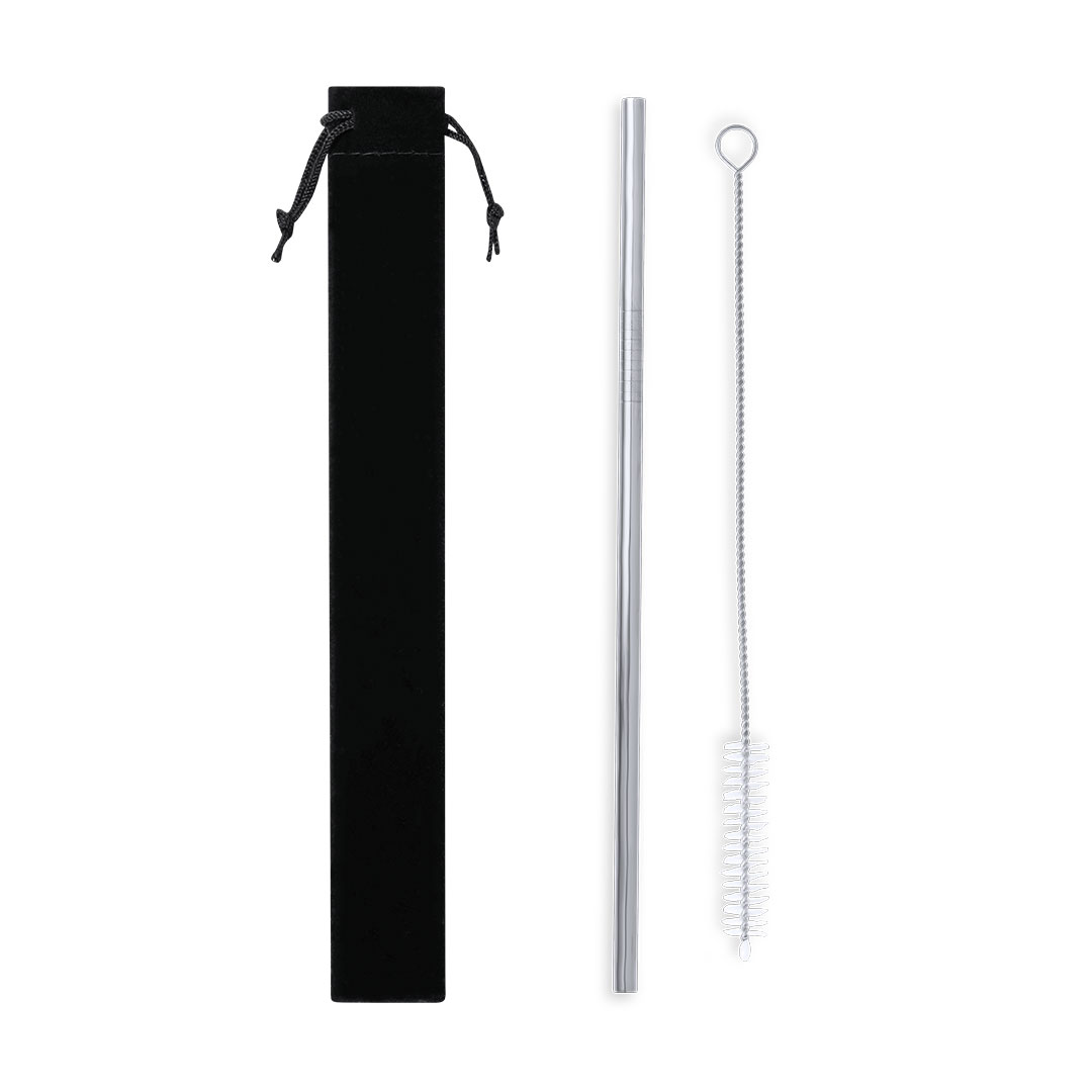 Juego de pajita reutilizable en acero inox. Con accesorio cepillo limpiador incluido y presentada en estuche de suave microfibra con cordones ajustables para mejor cierre.