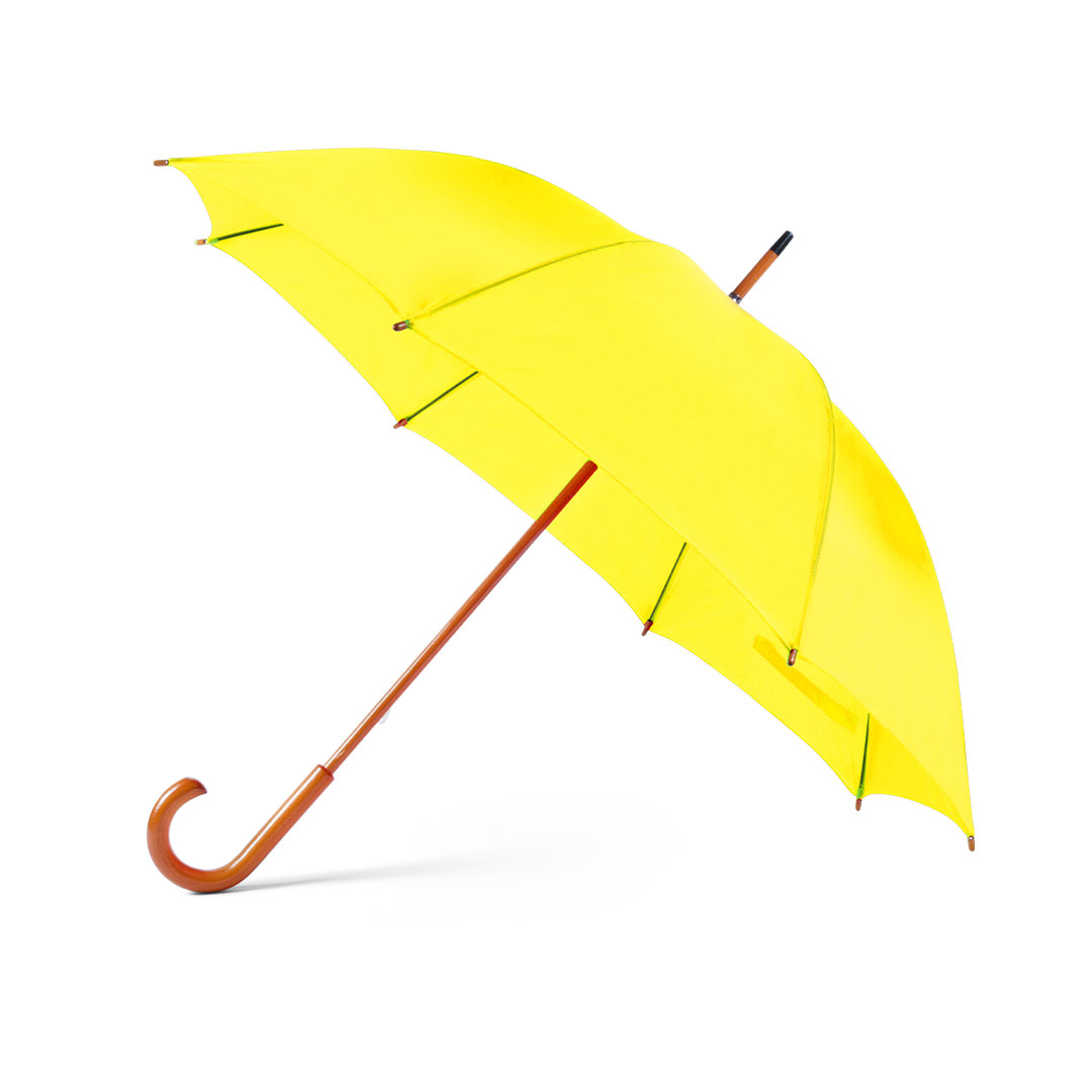 Paraguas de 8 paneles en variada gama de vivos colores. De 105cm de diámetro, con apertura manual y en resistente material poliéster. Con varillas metálicas en color negro, cierre de velcro y suave mango de madera en color natural.